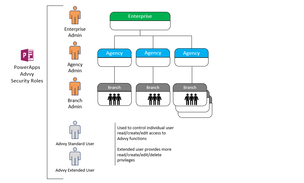 Advvy is enforced using Microsoft PowerApps Security. The following is a high-level look at how a security model is implemented in PowerApps.