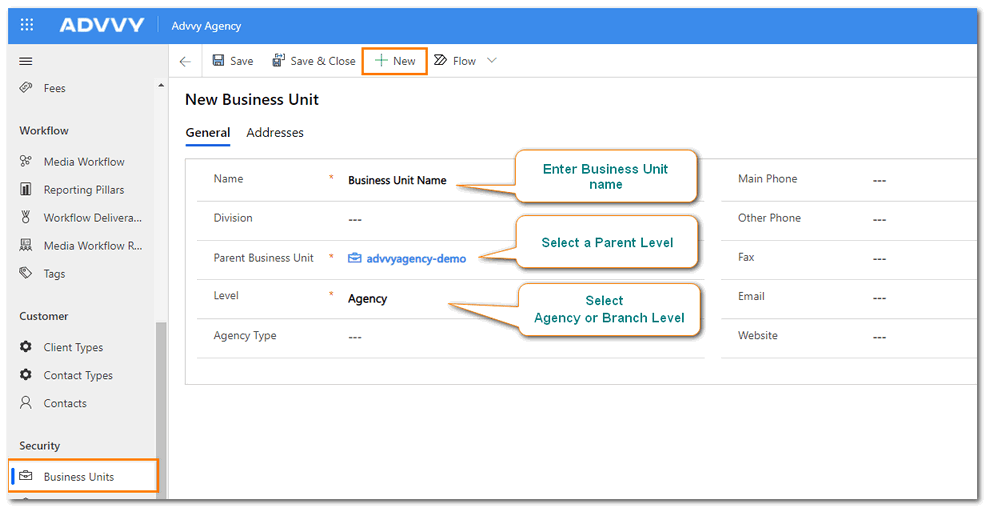 In a new Advvy tenancy there’s a “root” business unit from which all business units are connected to. This “root” business unit is created during Advvy’s setup and is where you’ll connect your first Enterprise level business unit.