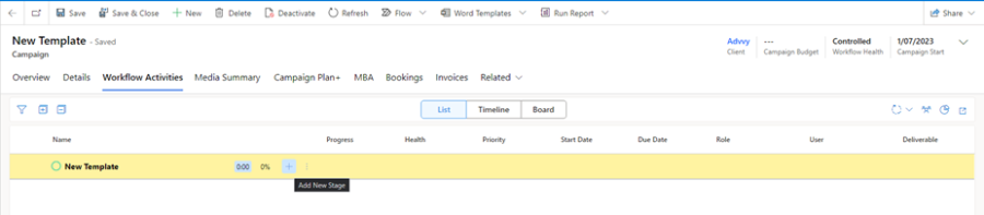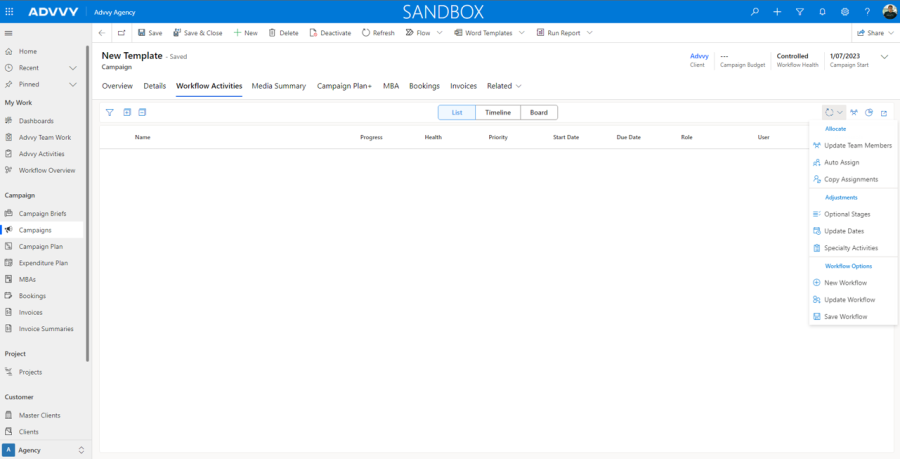 - By Leaving the Workflow Template selector BLANK, after you create the campaign, the Workflow Activities tab will be empty.
