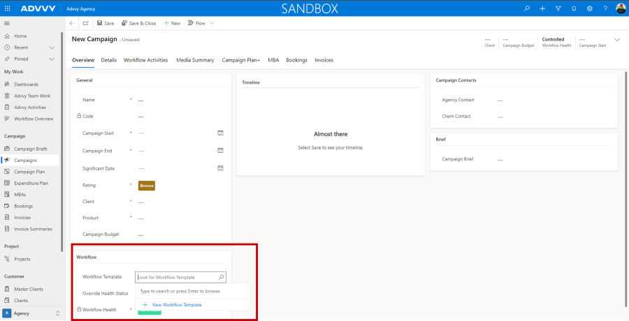 - To create a new Workflow from the control, when initially creating a new campaign or project leave the Workflow Template section BLANK. Do not select “New Workflow Template”. Create the Campaign with all the other required fields and go to the next step.