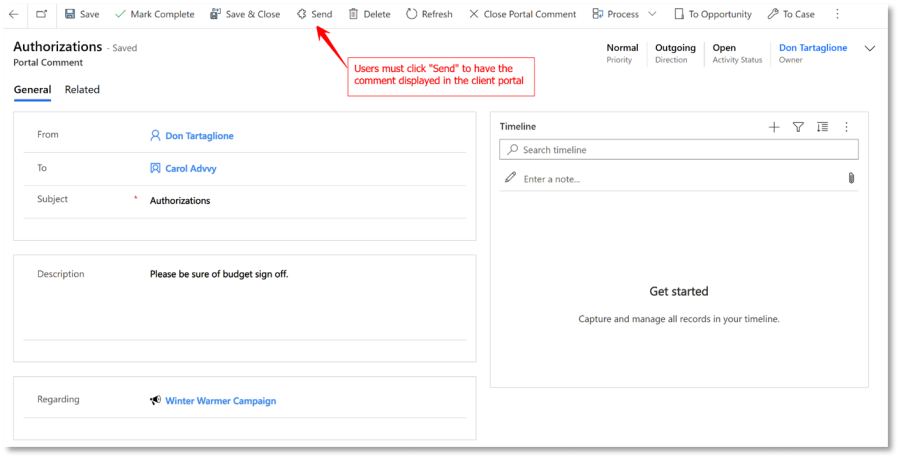 Once the note is created, and saved, the user must hit the send button on the top of the form for the comment to be sent to the portal. The note will appear in the Campaign Details section of the client portal.