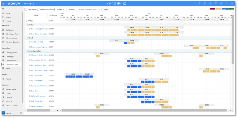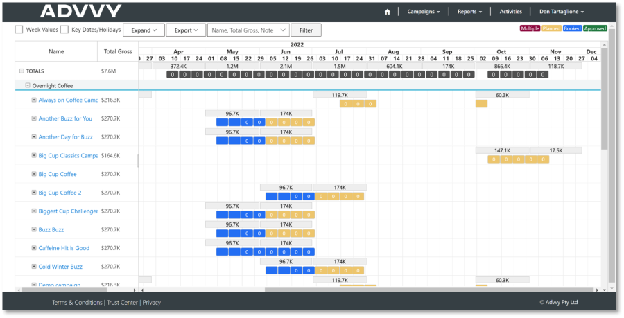 The year-long default view shows the user each campaign they have access to, its media types and flightings. Expenses are broken down by month, and when the Week Values checkbox is ticked in the top left corner, users will be able to see weekly expenditures.