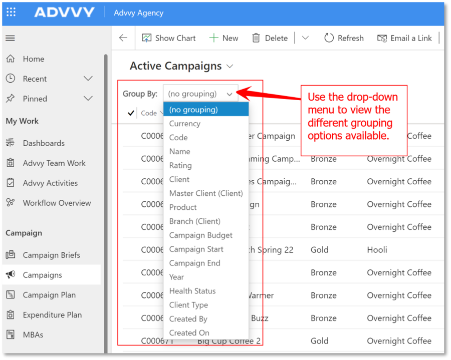User will notice a new drop-down menu that provides grouping options for the data presented in Advvy. This allows users to quickly group information via a variety of options.
