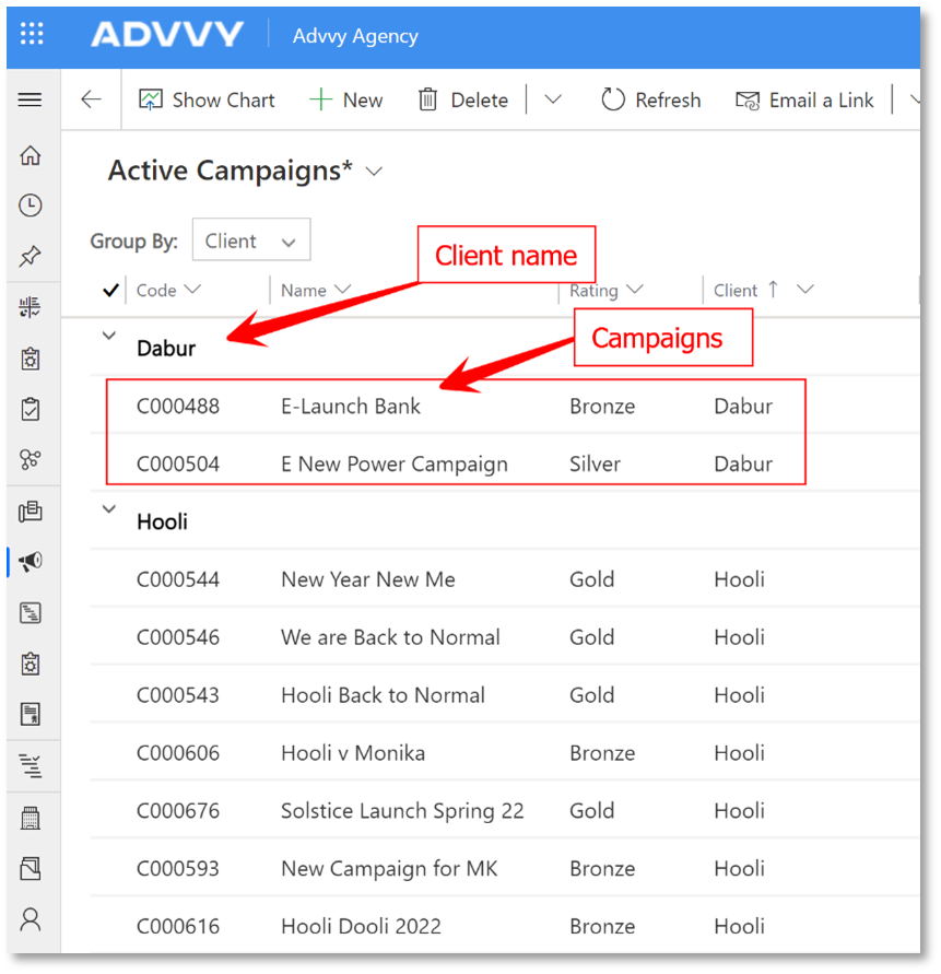 For example, in the Campaigns section, users can quickly group campaigns by client. This organizes the data allowing users to access the data they need quicker.