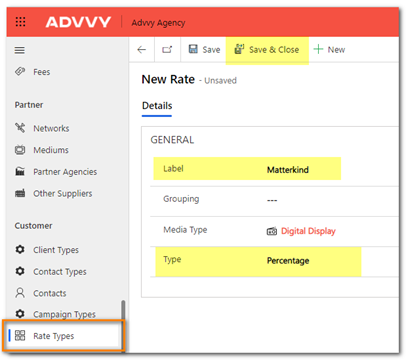 - Navigate to Agency Settings > Customer> Rate Types and click +NEW