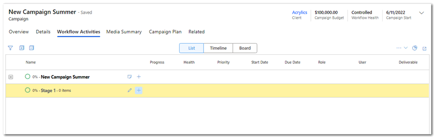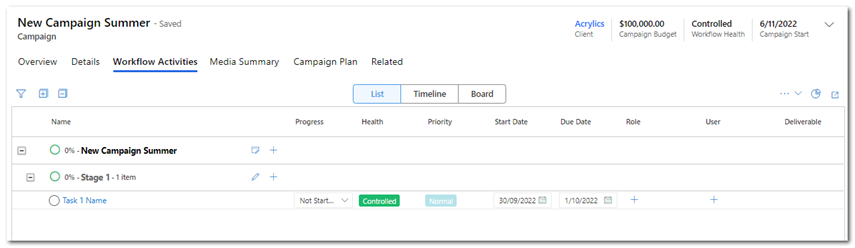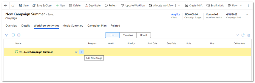 - Once you have selected the client, any default workflow will be displayed. [if you save the new campaign record at this step the predefined workflow will be applied].