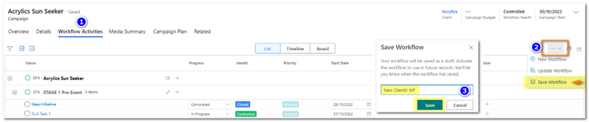 Once a Campaign workflow is created from scratch, it can be saved as a NEW workflow template that can be added to the existing suite of pre-defined workflows. ( See feature below for more about saving workflows)