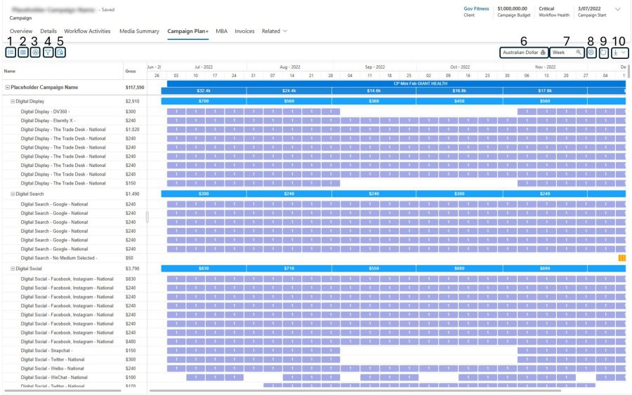 • Campaign Plan is an overview of all current active campaigns and their flights. This allows you to view multiple campaigns and their flights. Campaign Plan+ however, displays only the selected campaign record and the flights that are associated with that campaign.