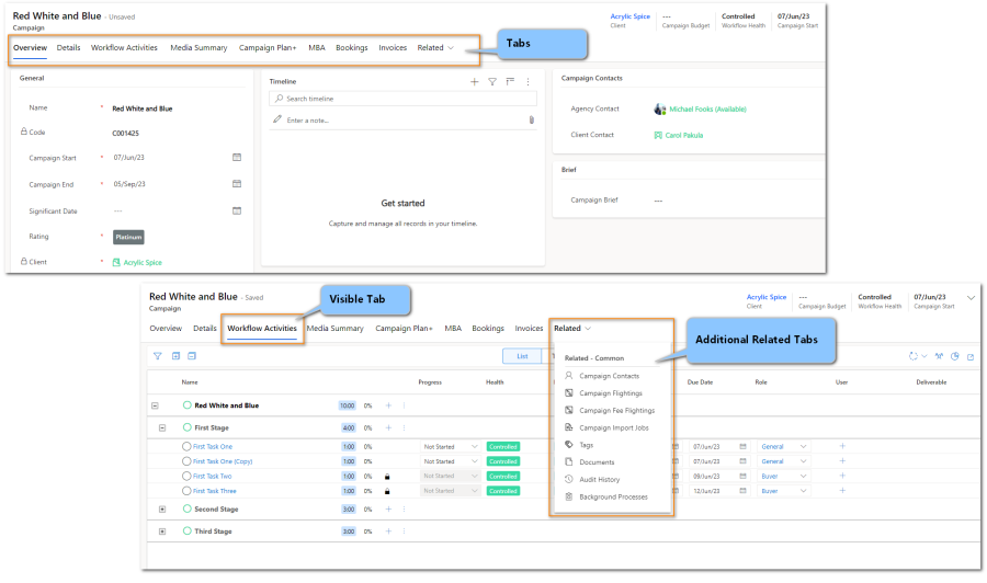 When a record is displayed, some information may be grouped into Tabs. These are mostly used for Campaign and client records, as well as for some administration settings.