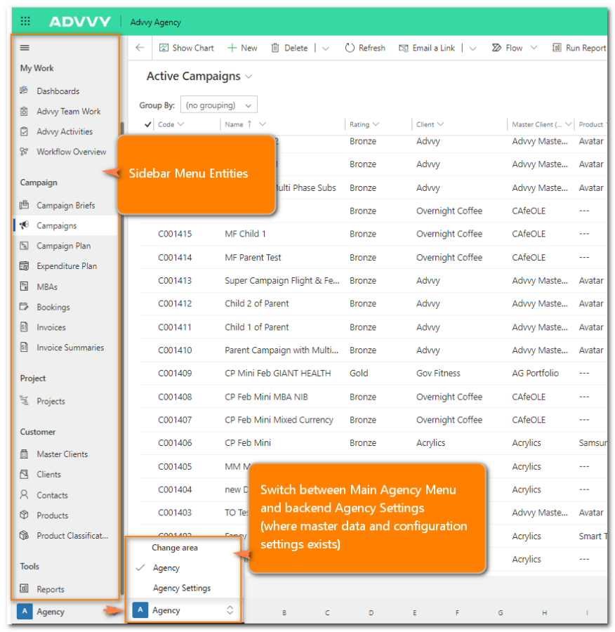 Menu options for Advvy are split into two areas – Agency Area and Agency Settings Area.