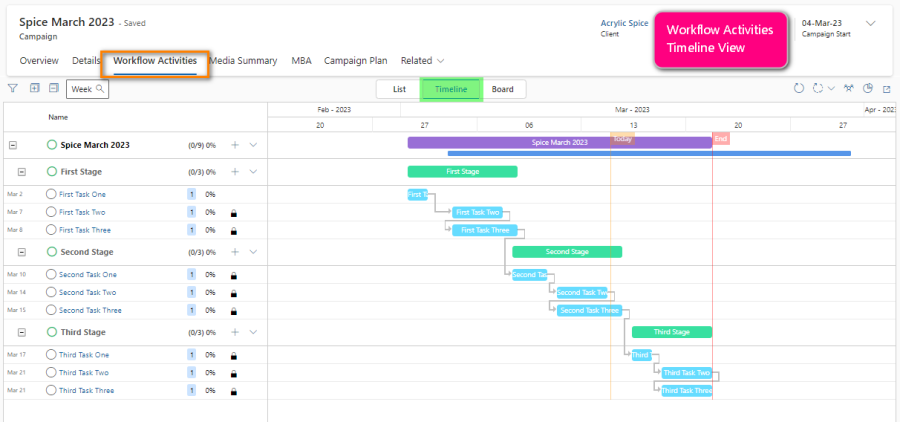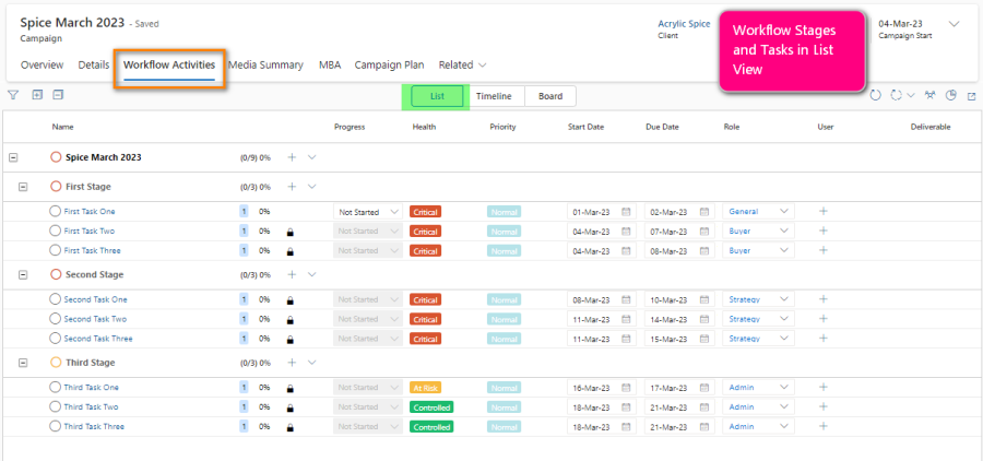 To view the tasks generated for the new campaign, click on the Workflow Activities tab. Stages are displayed Vertically with tasks listed below the selected stage.