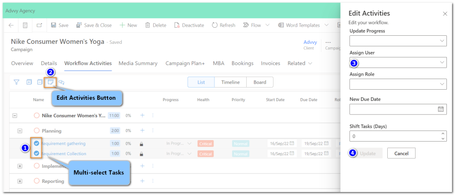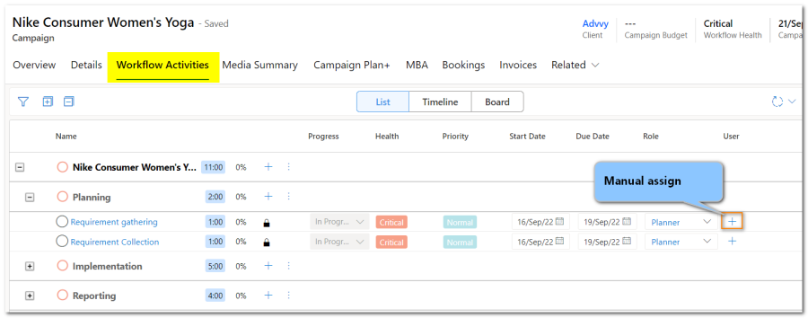 - Manual assignment can be performed directly within the specific campaign or project, from the Advvy Activities entity list or from the Advvy Team Work area.