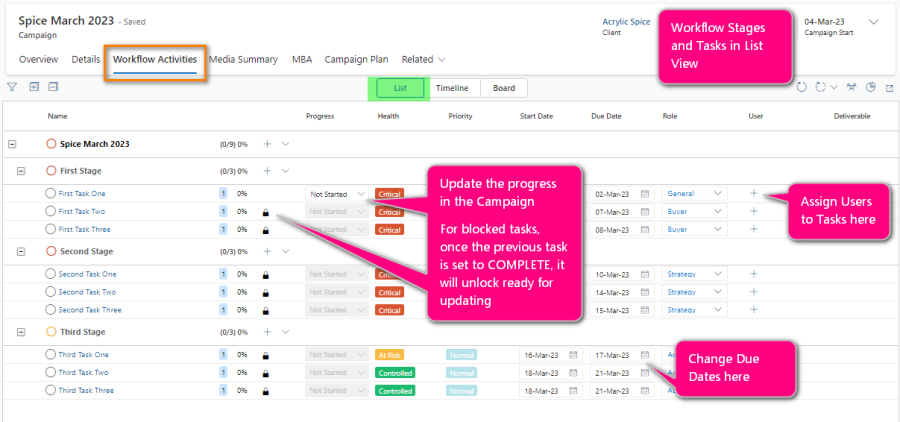 You can select a Campaign and view the Workflow Activities and update tasks within each stage.