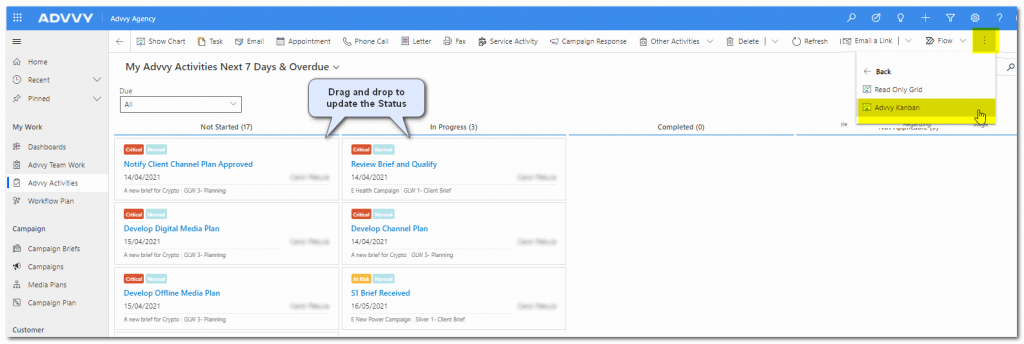 You can switch the Advvy Activities view from a List to a Kanban view, then drag and drop your tasks to update the status, or click the task name link to view the full task details.