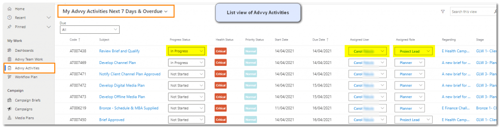 - My Advvy Activities Next 7 Days & Overdue– Displays all open tasks for the current user for the next 7 days only. Does not show Closed or Not Applicable tasks assigned to them.