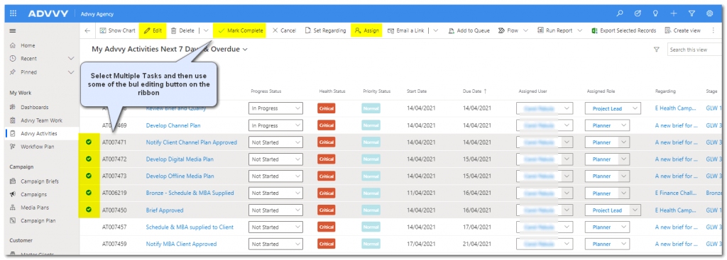 - You can multi-select tasks and choose to edit common fields in bulk via the “Edit, Assign or Mark Complete” buttons on the ribbon
