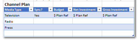 - Each row should have the corresponding Budget, Net Investment and Gross Investment totals for the Media Type
