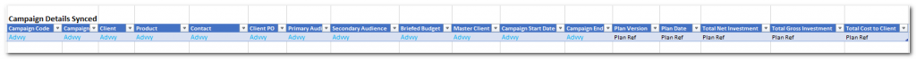 The Available Advvy fields are outlined below – you can define how little or how much data you’d like to sync to Advvy. - Each Field can be used to store your Media Plan values or calculations – we recommend taking the time to map your media plan fields to the Advvy data fields available.