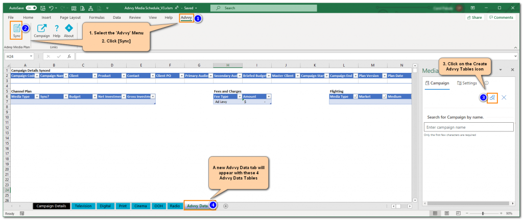 Setting up your media plan for use with Advvy involves adding a new Advvy Data worksheet tab into your Media Plan and configuring the 4 data tables with the information from your media plan.