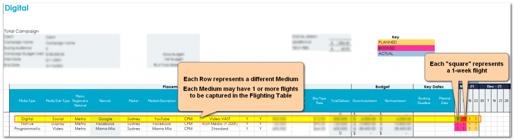 Each row in this table represents a single flight from the channel plan ie a weekly block. If you have added a Digital activity for Facebook that has a 4 week duration, this would need to be divided into 4 separate flight rows where each row has the same Media type, Medium, Market etc and differ in their Start & End Dates. A custom macro should be created to split your channel plan flighting into multiple weekly rows. Advvy provides this macro creation as a service. |