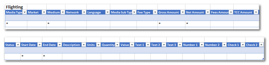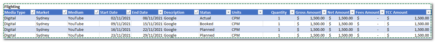 - For example if you have added a Digital activity for Facebook that has a 4 week duration, this would need to be divided into 4 separate flight rows where each row has the same Media Type, Medium, Market etc and only differ in their Start & End Dates, values, quantities and costs.