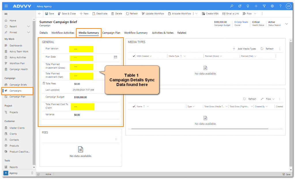 - Once a Media Plan is connected to a campaign the first 12 fields will be imported from the Advvy Campaign record during a sync.