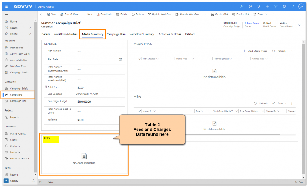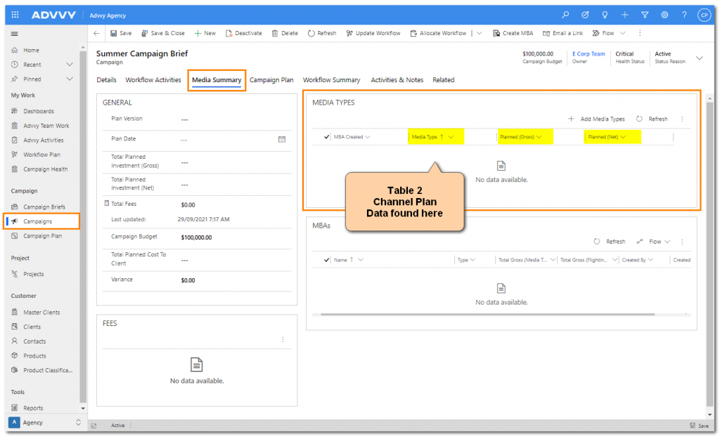 Your Master Media Plan requires an additional tab to be added to the spreadsheet. The tab contains pre-configured tables with recognised Advvy fields that relate to the data entities found in Advvy.